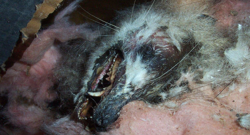 We are experts in dead animal removal, and take our job seriously. When removing dead animals, we do a COMPLETE job — not only do we remove the dead animal from your home or yard, we also decontaminate the area, deodorize it, and dispose of the animal or cremate it. If you aren't sure whether the stench in your house is due to a rotting carcass or another reason, we can sniff it out with our noses from our years of experience. We remove dead raccoons, dead opossums, dead skunks, dead squirrels, dead birds, even dead dogs and cats. We frequently remove dead rodents from inside walls, because poison kills rats and mice, who die in your house. We completely solve your dead animal problem by taking these steps:
